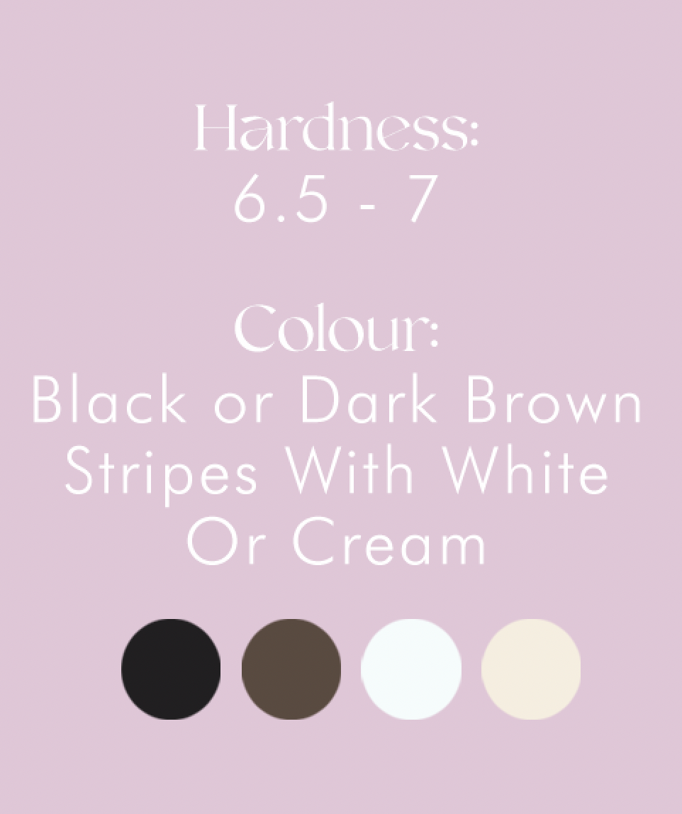 Zebra Jasper is a variety of microcrystalline Quartz, coloured by natural mineral inclusions such as iron oxides and manganese. These minerals create its distinctive black, brown, & white banded patterns, resembling zebra stripes. Although called “Jasper,” many geologists classify Zebra Jasper as a banded Chalcedony instead. It can be found in many locations including South Africa, India, Brazil, Russia, & the USA.