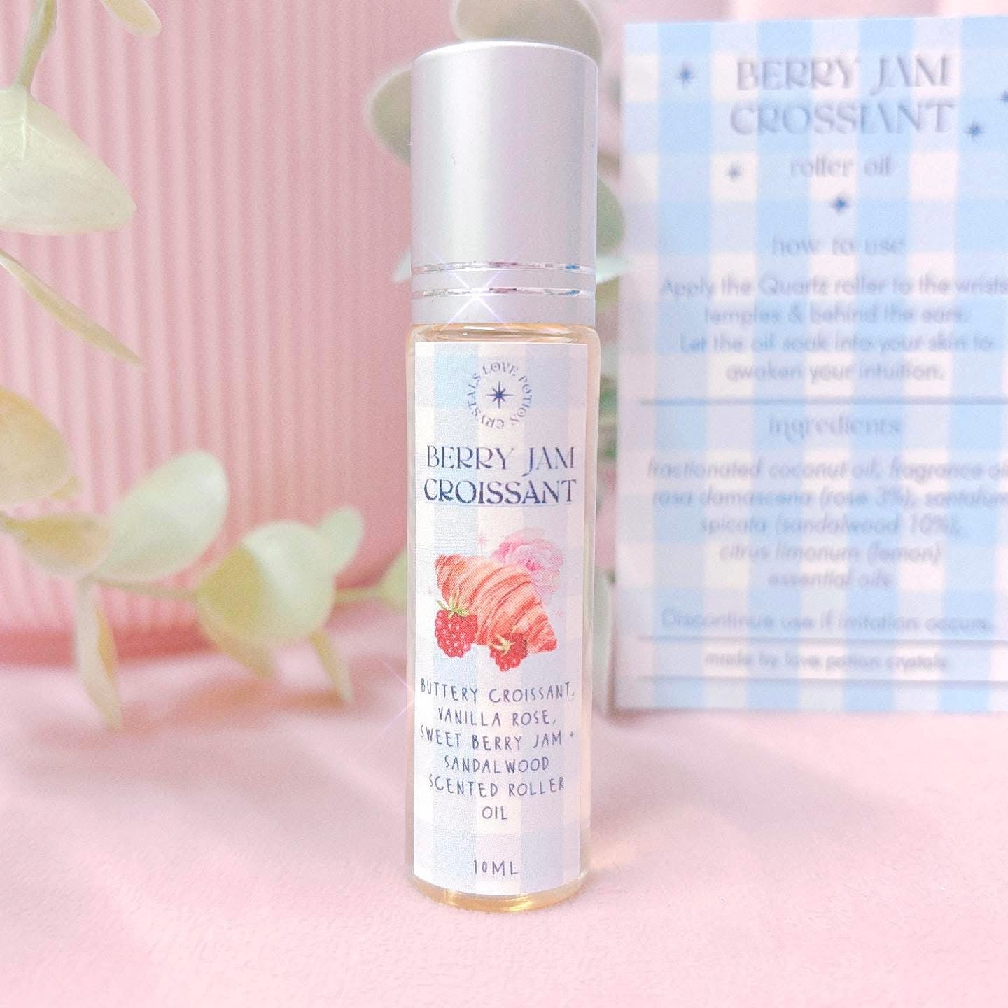 Buttery croissant, vanilla rose, sweet berry jam + sandalwood scented roller oil.