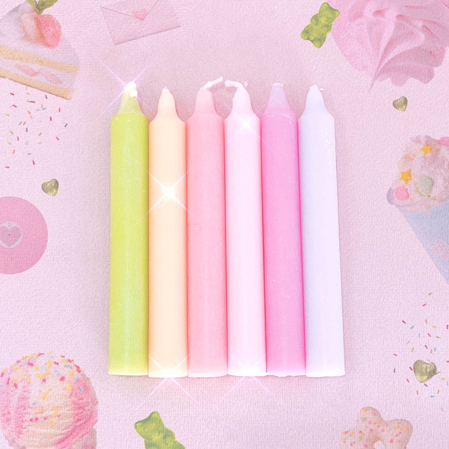 In this bundle you will receive 6 Wish Candles in the following colours: Lime, Lemon, Coral Pink, Blush Pink, Rose Pink & Lilac.