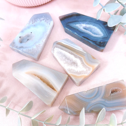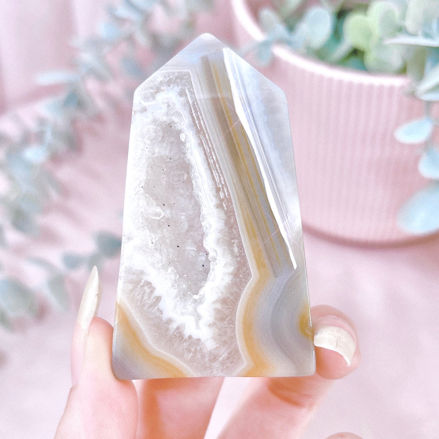 Agate holds a gentle, grounding energy that can guide you out of a state of overwhelm, & help you recenter. It allows you to move forward in life with strength & confidence. The colour found within Agate will often give insight into the power held within. Blue brings a soft, relaxing energy, which can help with truth & communication. Pink or Green can heal the heart & inspire self-love, growth & healing...