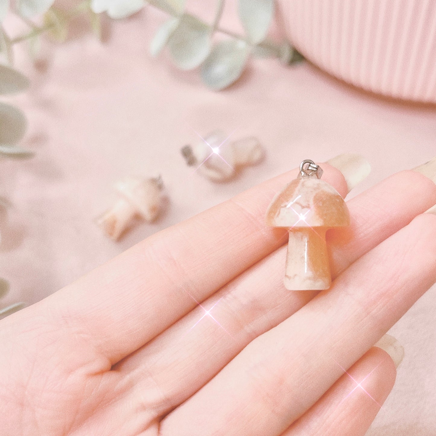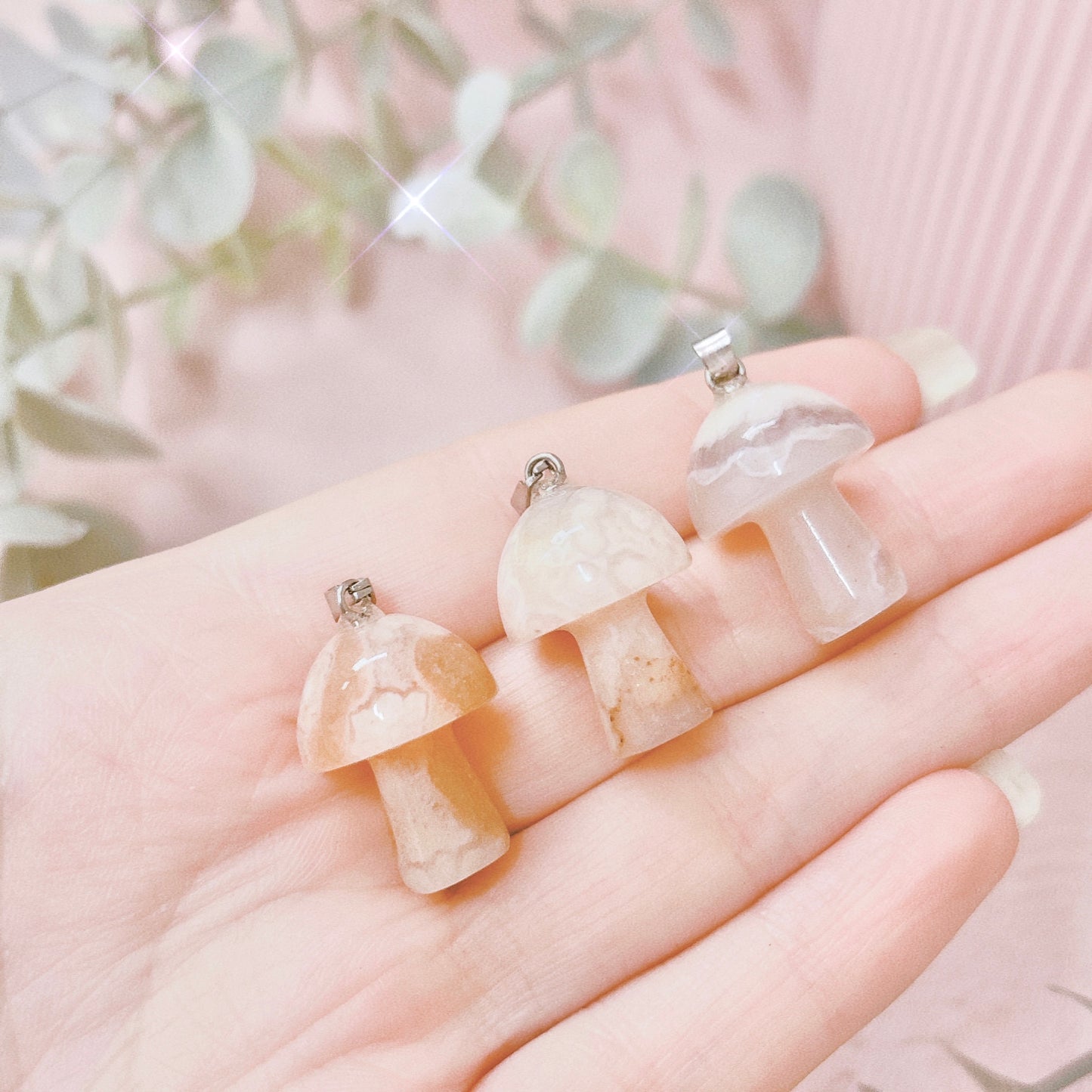 You will receive one flower agate mushroom pendant, selected intuitively. Necklaces are not included, sold separately.