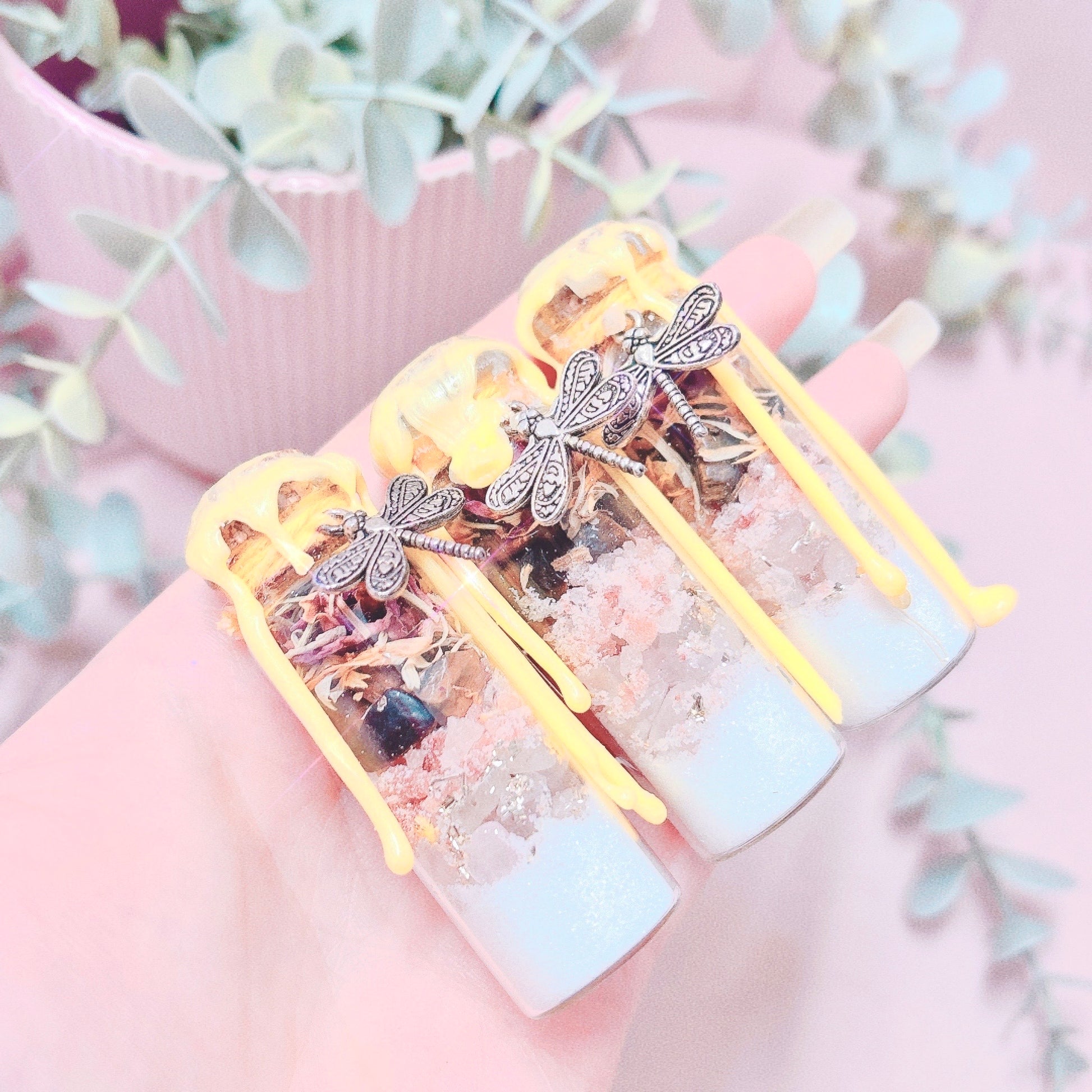 It contains a variety of joyful ingredients such as white sugar, rose quartz crystals, Pink Himalayan Salt, dried calendula, gold foil, tigers eye crystals, rose petals, rosemary & lime essential oil. These materials, alongside the programmed intention, all work together to bring happiness, abundance, optimism, radiance & positive energy into your life. It has been sealed with a charm, yellow ribbon & golden wax, to ensure the longevity of its purpose.