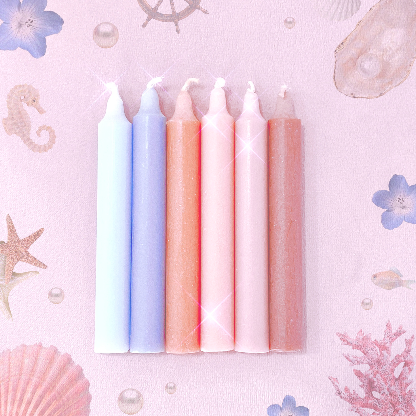In this bundle you will receive 6 Wish Candles in the following colours: Pastel Blue, French Blue, Baked Clay, Peach, Heritage Rose & Chocolate.