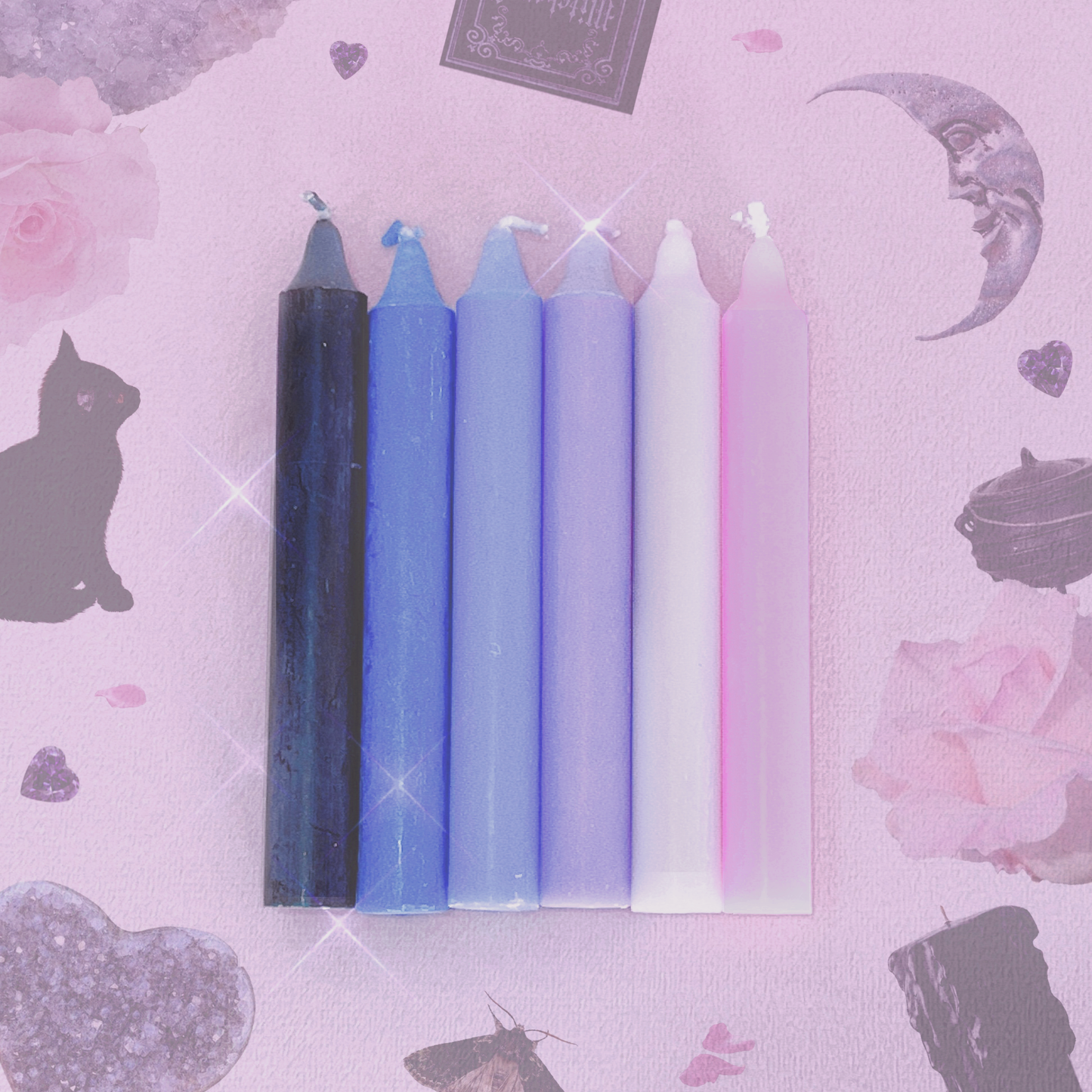 In this bundle you will receive 6 Wish Candles in the following colours: Black, Navy, Deep Purple, Purple, Lilac & Magenta.